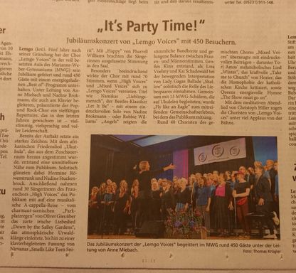 Unserem diesjährigen Jahreskonzert ging ein Auftritt mit Chor&More in der Paderborner Georgskirche mit einer besonderen Akustik voraus. Unser Jahreskonzert "LemgoVoices & Friends" mit den Paderborner Freunden im Lemgoer Marianne-Weber-Gymnasium war dann ein fulminanter Erfolg und der Besucheransturm von etwa 420 Zuhörern hat alle Erwartungen übertroffen! Wir konnten wieder mit einem abwechslungsreichen Programm überzeugen, wobei sich jeder Chor eigens präsentierte und einige Stücke mit allen gemeinsam gesungen wurden. Auch in diesem Jahr wurden wir musikalisch von Schülerinnen des MWGs unterstützt, diesmal mit Gesang und Ukulele.
